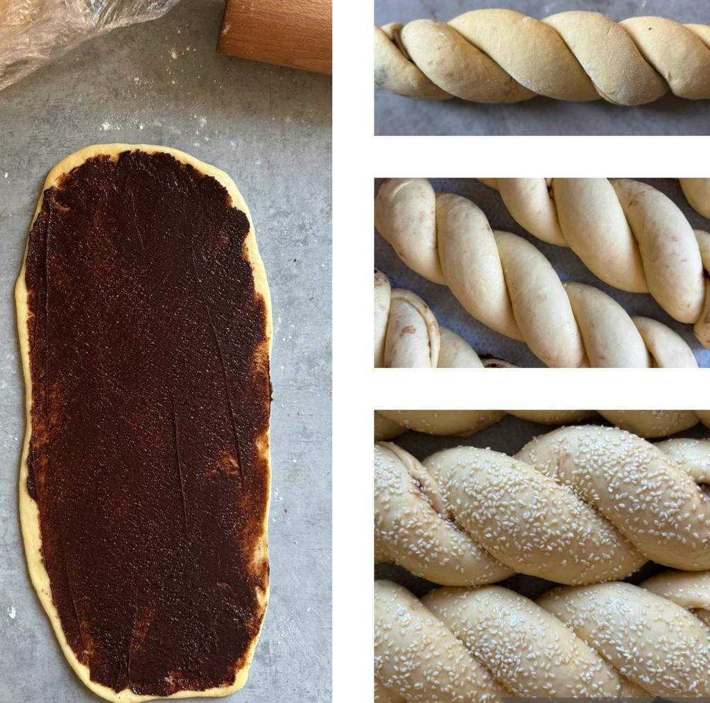 מרדדים כל כדור לעלה דק, שימו לב- ככל שתרדדו לעלה דק יותר כך תקבלו יותר שכבות של מילוי. מורחים ממלית השוקולד על כל משטח הבצק ומגלגלים לרצועה ארוכה.ניתן לפזר מעל מלית הקקאו מעט שוקולד קצוץ כדי לקבל טעם שוקולדי דומיננטי יותר. עושים כך עם חלקי הבצק כאשר כל שתי רצועות מחברים בצורת בורג ומניחים על תבנית תנור מרופדת בנייר אפייה או בתבנית אינגליש קייק.